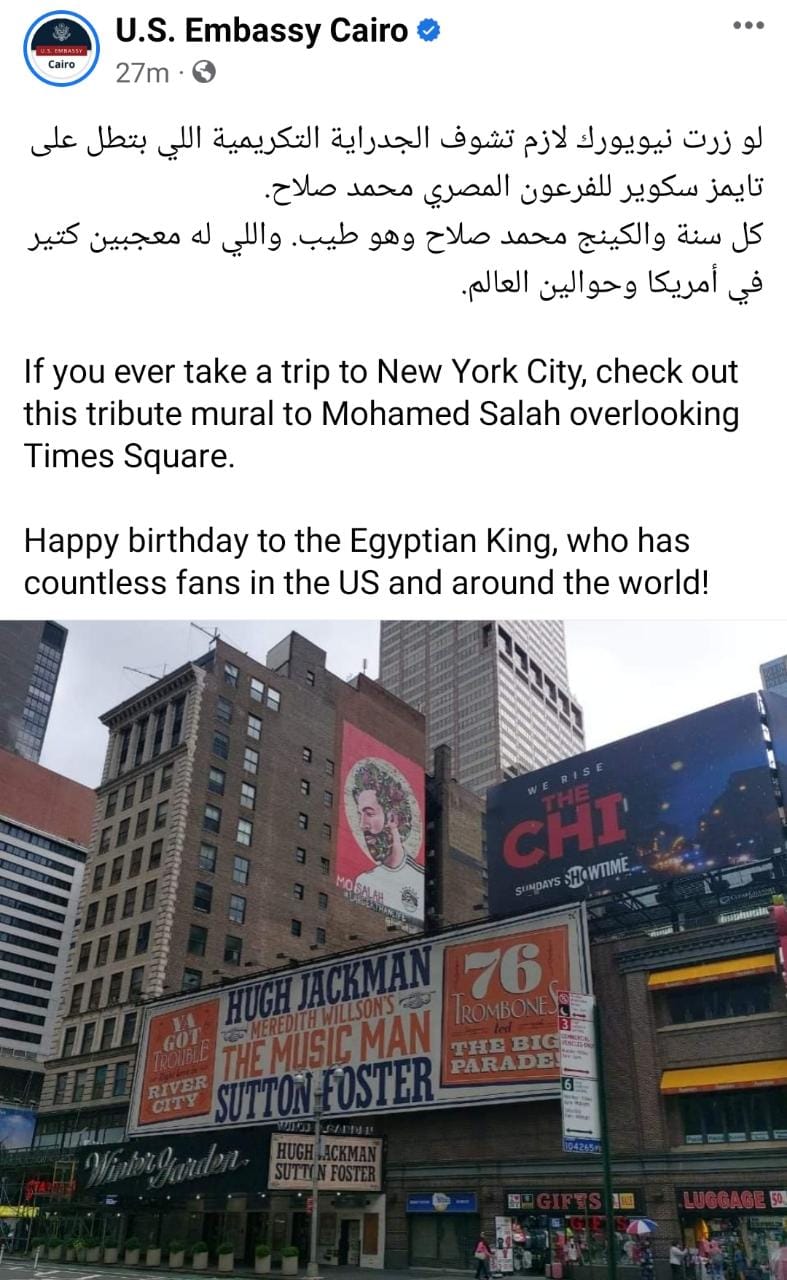 ونشرت الصفحة صورة للمصري عبر الجدران معلقه: "لو زرت نيويورك لازم تشوف الجدراية التكريمية اللي بتطل على تايمز سكوير للفرعون المصري محمد صلاح، كل سنة والكينج محمد صلاح وهو طيب، واللي له معجبين كتير في أمريكا وحوالين العالم".