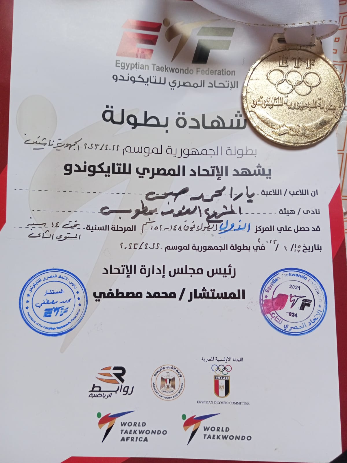 توجت يارا الصعيدي لاعبة تايكوندو المشروع القومي للموهبة والبطل الأوليمبى بكفر الشيخ، بالمركز الأول حاصدة ذهبية بطولة الجمهوريه للتايكوندو تحت 14سنه منافسات وزن تحت 152 سم وأقيمت الفاعليات في صالة جامعة حلوان الرياضية بمشاركة 600 لاعب ولاعبة يمثلون 100 نادى وهيئه رياضية على مستوى الجمهورية فى الفترة من 15 حتى 17 يونيو التى ينظمها الاتحاد المصري للتايكوندو تحت رعاية الدكتور أشرف صبحى، وزير الشباب والرياضة، واللواء جمال نور الدين، محافظ كفر الشيخ.