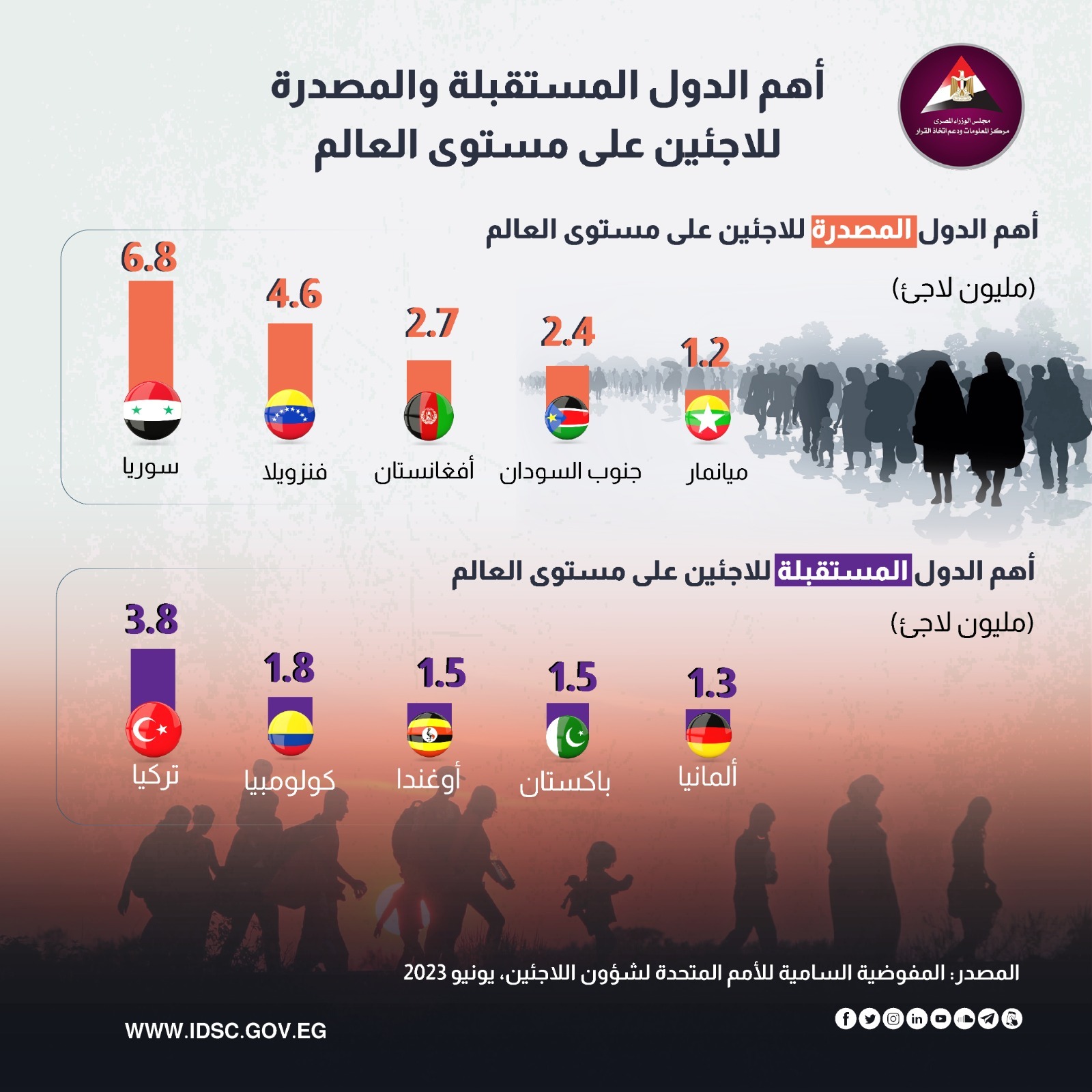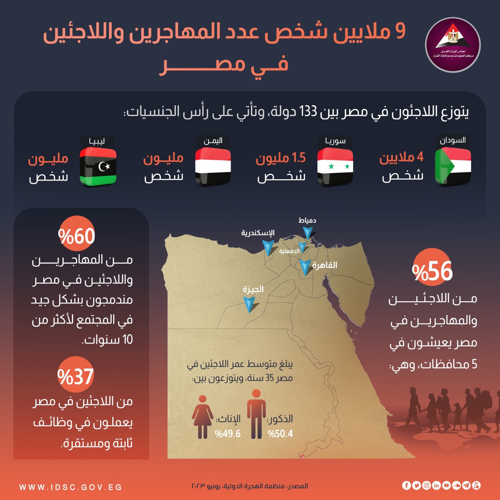 هذا وتتوزَّع جنسيات اللاجئين في مصر بين 133 دولة، من بينها: السودان بنحو 4 ملايين شخص، وسوريا بنحو 1.5 مليون شخص، وليبيا بنحو مليون شخص. أما على المستوى العالمي فقد شهدت أعداد اللاجئين ارتفاعًا كبيرًا في السنوات الأخيرة من نحو 65 مليون لاجئ في عام 2015 لتصل إلى نحو 101 مليون لاجئ في 2022، متأثرة بارتفاع حدة الصراعات الداخلية والحروب والكوارث الطبيعية في عديد من المناطق حول العالم.