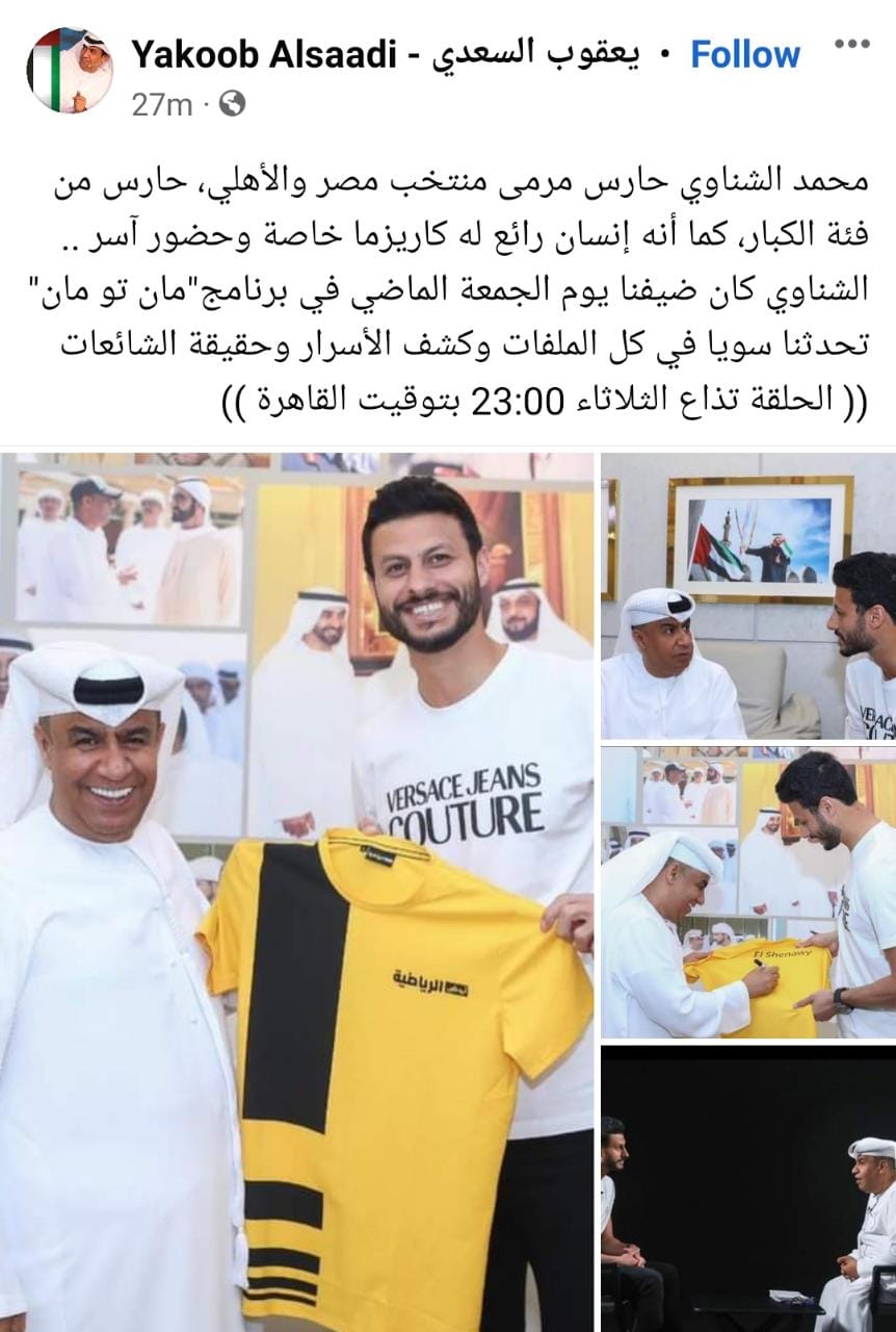 وقال يعقوب السعدي عبر حسابه الشخصي بموقع التواصل الاجتماعي"فيسبوك": "محمد الشناوي حارس مرمى منتخب مصر والأهلي، حارس من فئة الكبار، كما أنه إنسان رائع له كاريزما خاصة وحضور آسر، الشناوي كان ضيفنا يوم الجمعة الماضي في برنامج"مان تو مان" تحدثنا سويا في كل الملفات وكشف الأسرار وحقيقة الشائعات (( الحلقة تذاع الثلاثاء 23:00 بتوقيت القاهرة )).