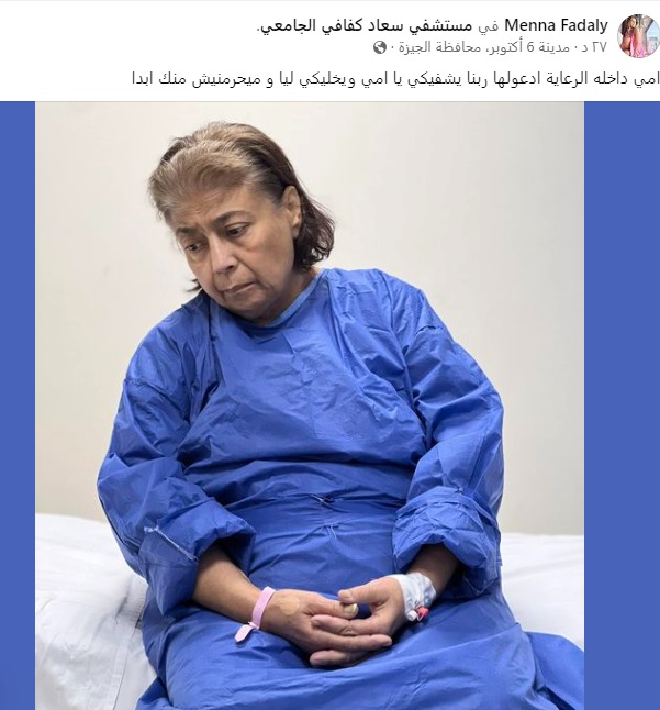 نشرت منة فضالي صورة والدتها بملابس المستشفى، عبر صفحتها على موقع التواصل الإجتماعي “الفيسبوك”قائلة: “أمي داخلة الرعاية ادعولها ربنا يشفيكي يا أمي ويخليكي ليا وميحرمنيش منك ابدا”، وحرص عدد كبير من الجمهور على الدعاء لوالدة الفنانة بالشفاء العاجل".