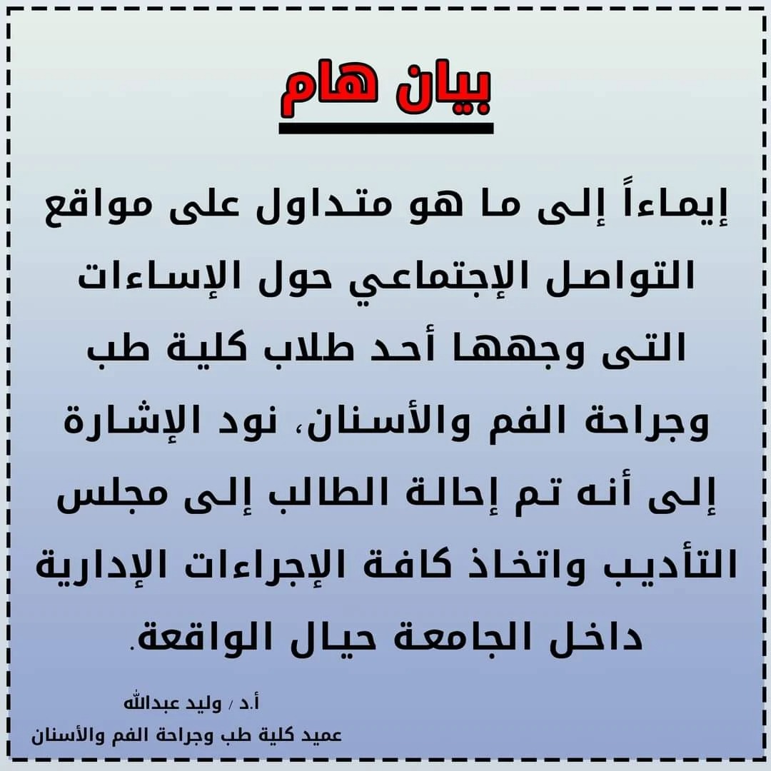 وجاء بيان جامعة الزقازيق كما يلي: “إيماء إلى ما هو متداول على مواقع التواصل الاجتماعى حول الإساءات التى وجهها أحد طلاب كلية طب وجراحة الفم والأسنان، نود الإشارة إلى أنه تم إحالة الطالب إلى مجلس التأديب واتخاذ كافة الإجراءات الإدارية داخل الجامعة حيال الواقعة”.