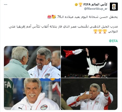 ونشر الاتحاد الدولي لكرة القدم فيفا، عبر حسابه الرسمي على مواقع التواصل الإجتماعي تويتر صورا لـ المدرب المصري، وعلق عليها: يحتفل حسن شحاتة اليوم بعدي ميلاده الـ 76، مدرب الجيل الذهبي لمنتخب مصر الذي فاز بثلاثة ألقاب لكأس أمم إفريقيا علي التوالي.