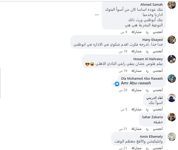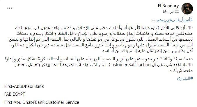 وقال صاحب الواقعة ،" بنك أبو ظبي الأول ( عودة سابقاً ) هو أسوأ بنوك مصر على الإطلاق و ده من واحد عميل في سبع بنوك مشوفتش خدمة عملاء و ماكينات إيداع عطلانة و رسوم على الإيداع داخل البنك و ابتكار رسوم و دمغات لخصمها من أقساط العميل اللي بتكون مدفوعة في مواعيدها و بالتالي تقل القيمة اللي تم إيداعها و تصبح أقل من قيمة القسط فينزل عليها رسوم تأخير و إنت تكون دافع القسط قبل ميعاده غير في الكيان ده اللي أقل بكتيرررررر من إنه يتقال عليه إسم بنك من أساسه".