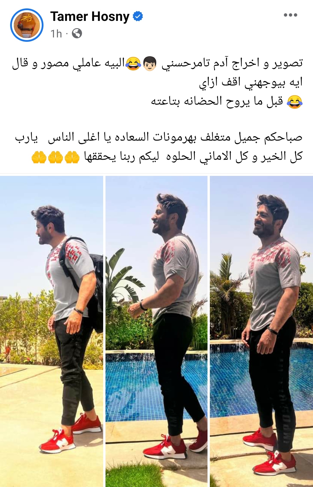 تابع تامر حسني:" صباحكم جميل متغلف بهرمونات السعاده يا اغلى الناس يارب كل الخير و كل الاماني الحلوه ليكم ربنا يحققها".
