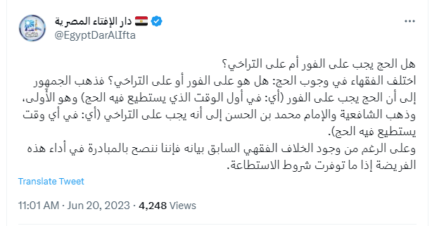 وأوضحت في تغريدة عبر حسابها الرسمي على مواقع التواصل الاجتماعي تويتر، أن الجمهور ذهب إلى أن الحج يجب على الفور، أي في أول الوقت يستطيع فيه الحج، وهو الأَولى.