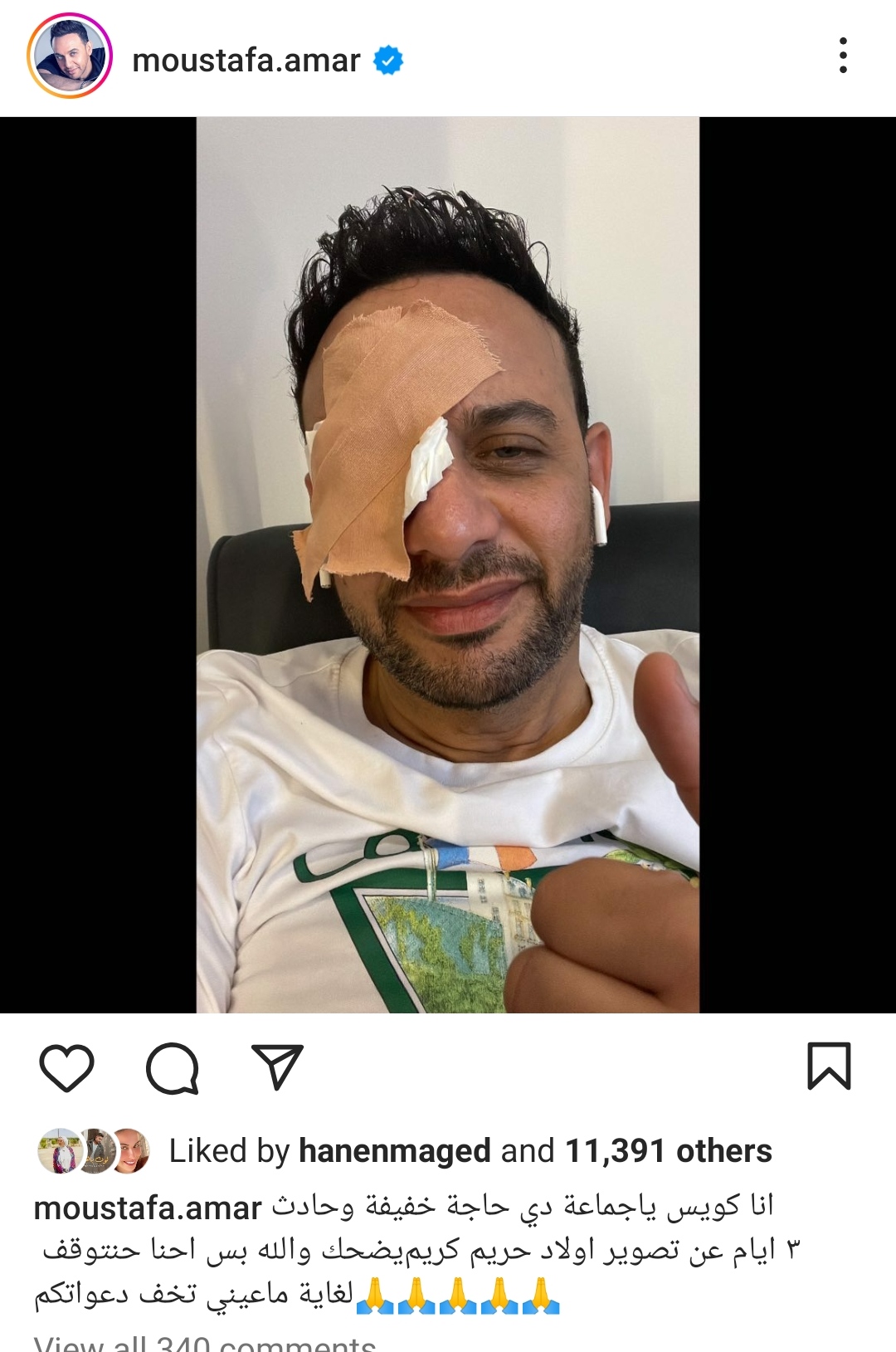 وكتب عبر صفحته على موقع تبادل الصور والفيديوهات "إنستجرام" قائلا:" أنا كويس يا جماعة، دي حاجة خفيفة، وحادث يضحك والله إحنا هنتوقف 3 أيام عن تصوير أولاد حريم كريم لغاية ما عيني تخف.. دعواتكم".