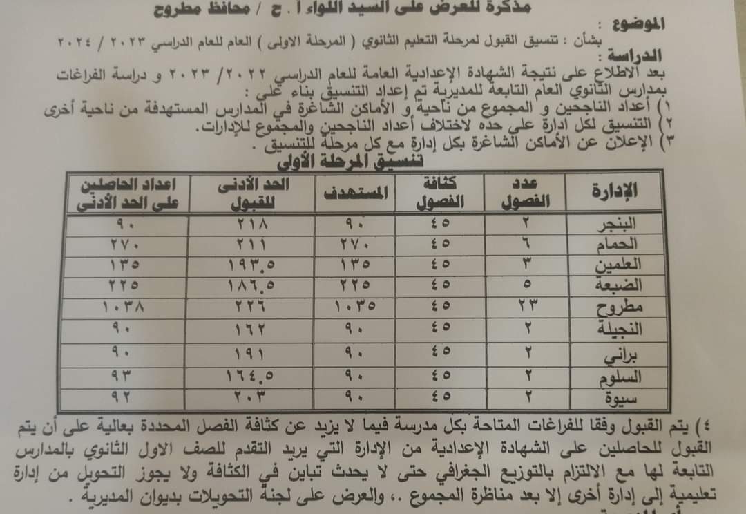 اعتمد اللواء خالد شعيب محافظ مطروح تنسيق القبول بمرحلة التعليم الثانوي العام والفني للعام الدراسى٢٠٢٣ / ٢٠٢٤"المرحلة الاولى " على مستوى مراكز ومدن المحافظة للعام الدراسى بعد حصر ودراسة الأماكن الشاغرة بالمدارس المختلفة وأعداد الناجحين والمجموع والتنسيق لكل إدارة على حده .