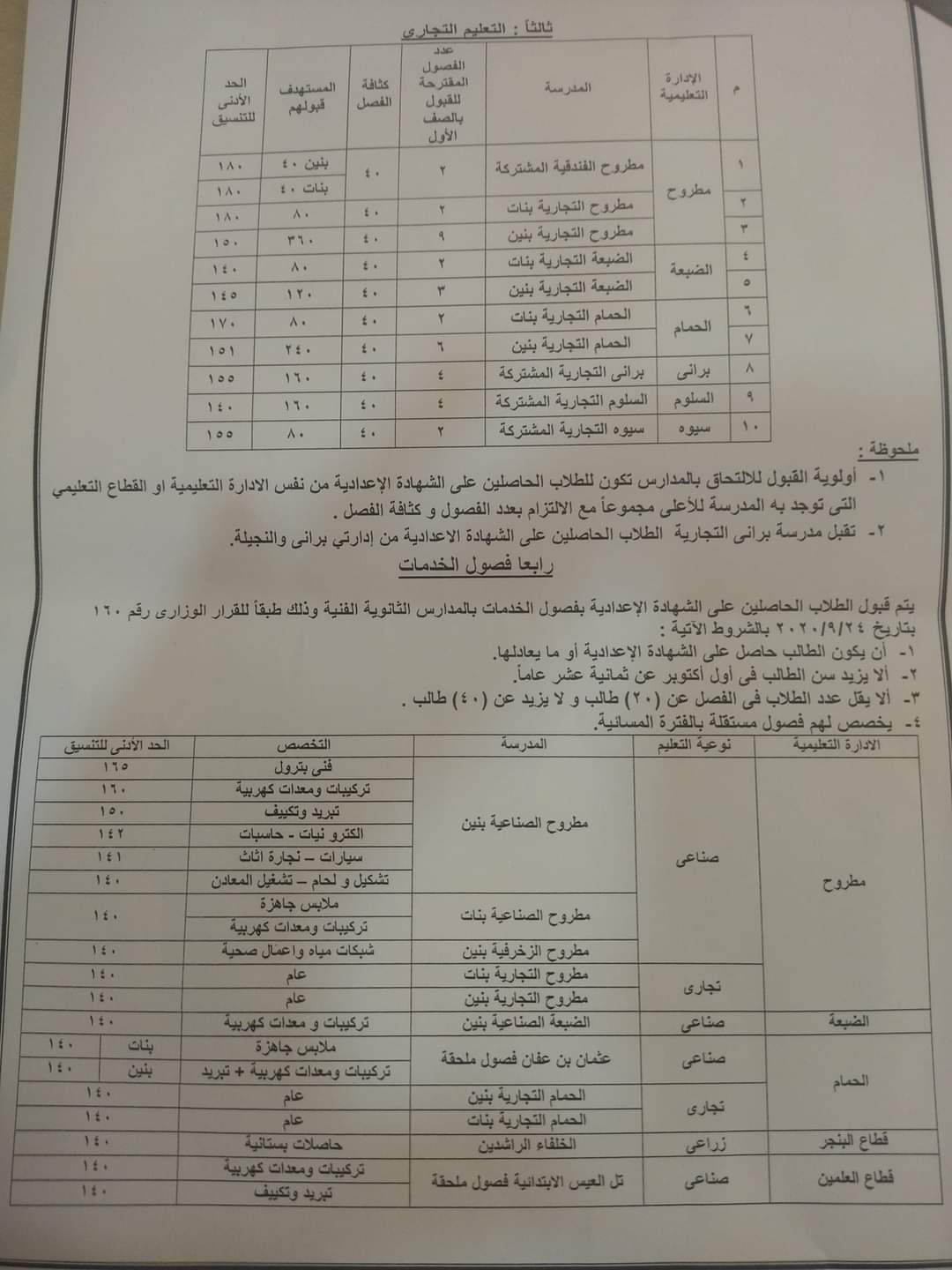 مدرسة مطروح الفندقية المشتركة الحد الادنى للقبول ١٨٠درجة للبنين والبنات ومدرسة مطروح التجارية بنات الحد الأدنى ١٨٠درجة ومدرسة مطروح التجارية بنين ١٥٠درجة ،ومدرسة الضبعة التجارية بنات ١٤٠درجة مدرسة الضبعة التجاري بنين ١٤٥ درجة ومدرسة الحمام التجارية بنات ١٧٠درجة والحمام التجارية بنين ١٥١ درجة ومدرسة برانى التجارية المشتركة ١٥٥ درجة تقبل الطلاب الحاصلين على الإعدادية من إدارتي براني والنجيلة ، والسلوم التجارية المشتركة ١٤٠ درجة ومدرسة سيوة التجارية ١٥٥ درجة .
