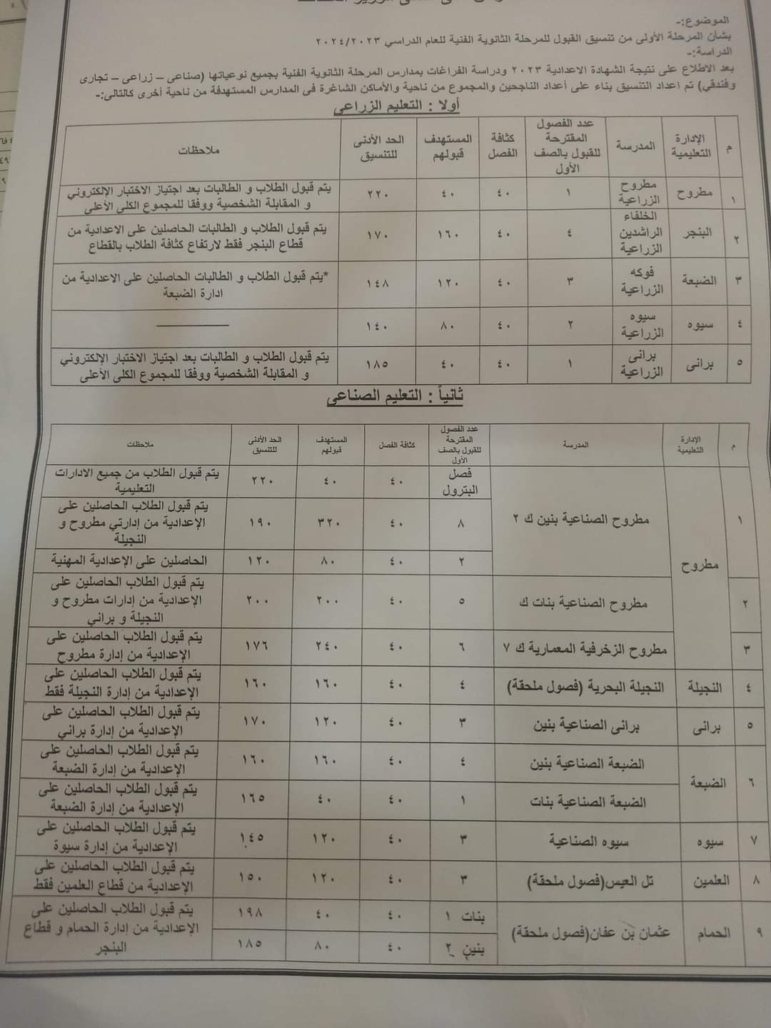 و مدرسة الخلفاء الراشدين الزراعية بإدارة البنجر التعليمية ١٧٠ درجة ويقتصر القبول على الطلاب الحاصلين على الإعدادية من قطاع البنجر فقط نظرا لارتفاع كثافة الطلاب بالقطاع كما جاء الحد الادنى للقبول بمدرسة فوه الثانوية الزراعية بإدارة الضبعة ١٤٨ درجة ومدرسة سيوة الزراعية الحد الادنى للقبول ١٤٠ درجة ،وبراني الزراعية ١٨٥درجة ويتم قبول الطلاب والطالبات فيها بعد اجتياز الاختبار الإلكتروني والمقابلة الشخصية وفقا الكلى الاعلى .