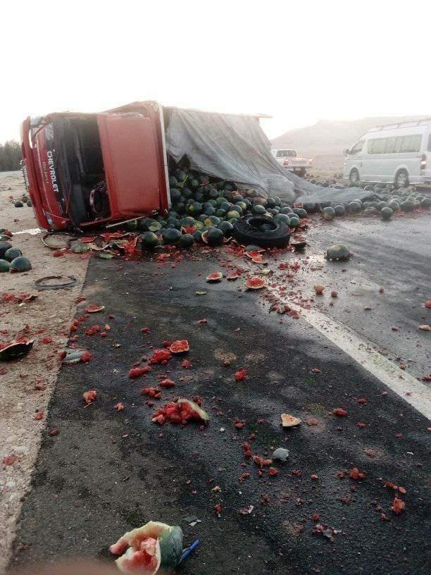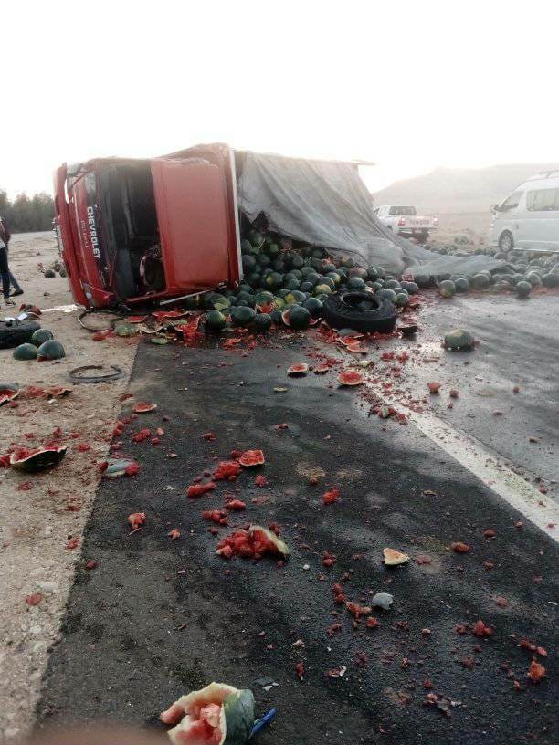 "البطيخ كله راح على الأسفلت".. انقلاب سيارة نقل وإصابة سائقها على "صحراوي قنا"