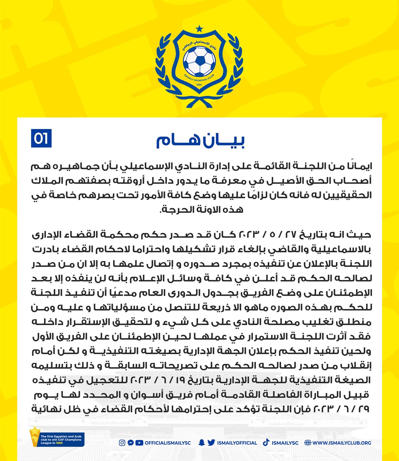 حيث إنه بتاريخ 7/5/2023 كان قد صدر حكم محكمة القضاء الإداري بالإسماعيلية والقاضي بإلغاء قرار تشكيلها واحتراما لأحكام القضاء بادرت اللجنة بالإعلان عن تنفيذه بمجرد صدوره و اتصال علمها به إلا ان من صدر لصالحه الحكم قد أعلن في كافة وسائل الإعلام بأنه لن ينفذه إلا بعـد الاطمئنان على وضع الفريق بجدول الدوري العام مدعيًا أن تنفيذ اللجنة للحكم بهذه الصورة ما هو الا ذريعة للتنصل من مسؤولياتها وعليه ومن منطلق تغليب مصلحة النادي على كل شيء و لتحقيق الاستقرار داخـلـه فقد آثرت اللجنة الاستمرار في عملها لحين الاطمئنان على الفريق الأول ولحين تنفيذ الحكم بإعلان الجهة الإدارية بصيغته التنفيذية و لكن أمام انقلاب من صدر لصالحه الحكم على تصريحاته السابقة و ذلك بتسليمه الصيغة التنفيذية للجهة الإدارية بتاريخ 19/1/2023 للتعجيل في تنفيذه قبيل المباراة الفاصلة القادمة أمام فريق أسوان والمحدد لها يوم 29/6/2023 فإن اللجنة تؤكد على احترامها لأحكام القضاء في ظل نهائية".