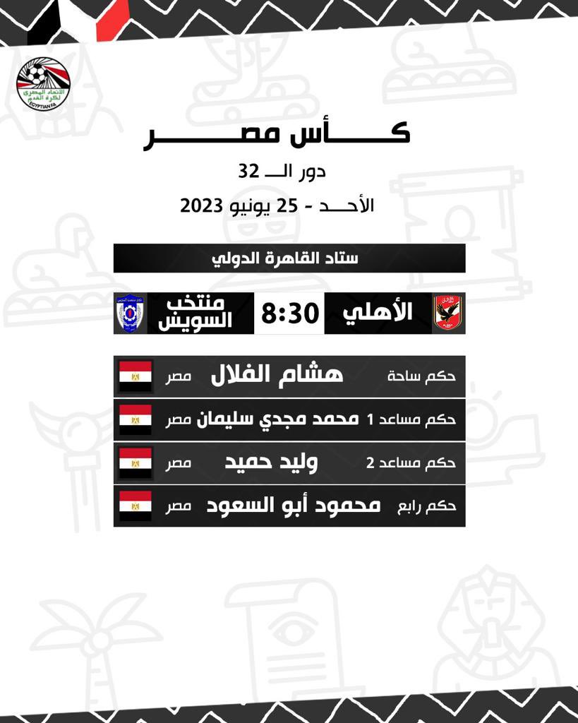 أعلنت لجنة الحكام باتحاد الكرة، عن طاقم حكام مباراة الأهلي ومنتخب السويس، المؤجلة من دور الـ 32 لبطولة كأس مصر، والتي تقام غدا الأحد على ستاد القاهرة الدولي.
