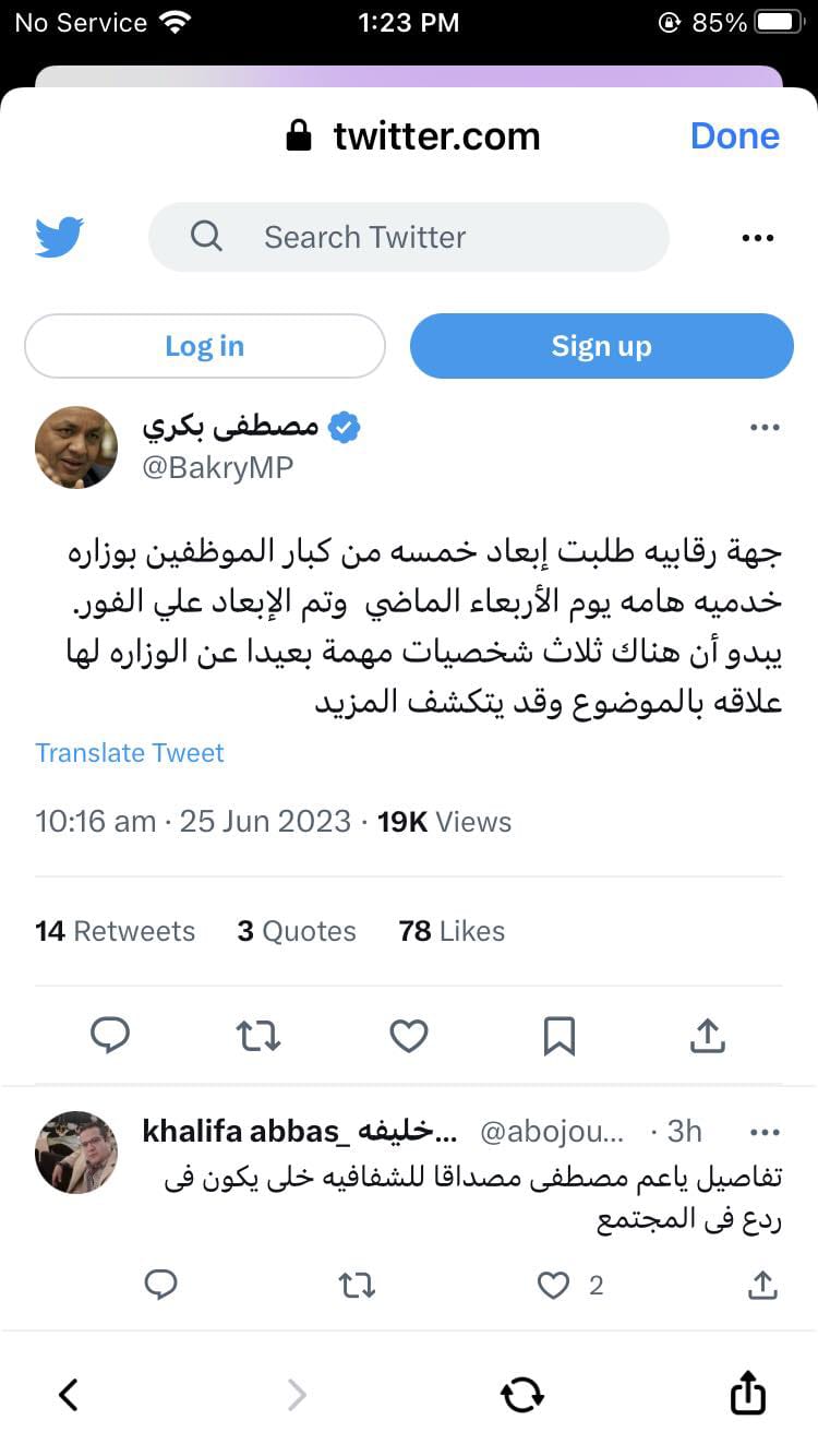 وقال مصطفى بكري في تغريدة له عبر حسابه الرسمي على موقع التغريدات القصيرة "تويتر"، "جهة رقابيه طلبت إبعاد خمسه من كبار الموظفين بوزاره خدمية هامة يوم الأربعاء الماضي وتم الإبعاد علي الفور، يبدو أن هناك ثلاث شخصيات مهمة بعيدا عن الوزاره لها علاقه بالموضوع وقد يتكشف المزيد"