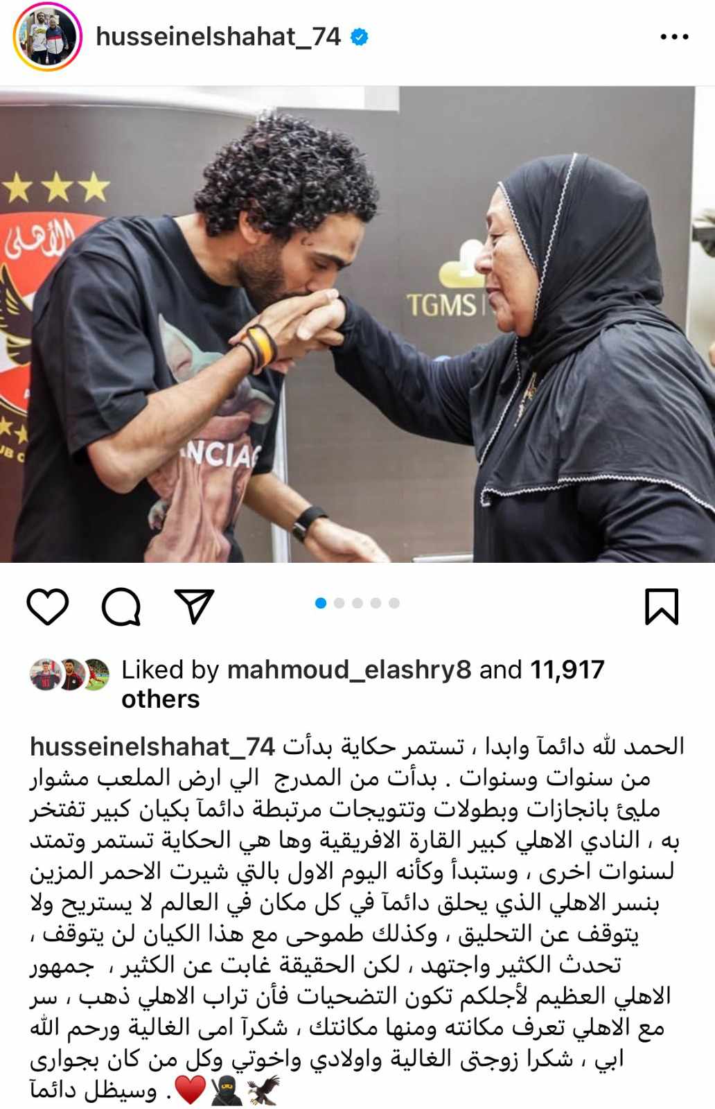 وكتب حسين الشحات عبر حسابه الرسمي بموقع التواصل الاجتماعي "انستجرام" :" الحمد لله دائمآ وابدا، تستمر حكاية بدأت من سنوات وسنوات، بدأت من المدرج الي ارض الملعب مشوار مليئ بانجازات وبطولات وتتويجات مرتبطة دائمآ بكيان كبير تفتخر به".