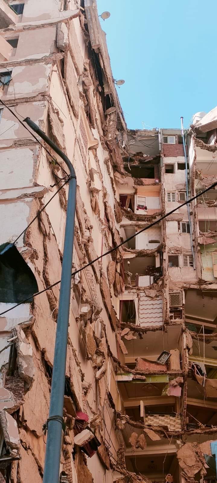 وتوجه رئيس حي المنتزة أول بصحبة قوات الحماية المدنية والحريق وسيارات الإسعاف والأمن إلى مكان البلاغ، وتبين سقوط عقار مكون من 13 دورا مأهول بالسكان ووجود عدد كبير من قاطنيه تحت الأنقاض وآخرين محاصرين بسبب إنهيار سلم العقار وتحاول قوات الحماية المدنية والحريق إنقاذ وانتشال الضحايا بشكل سريع قبل فوات الأوان.