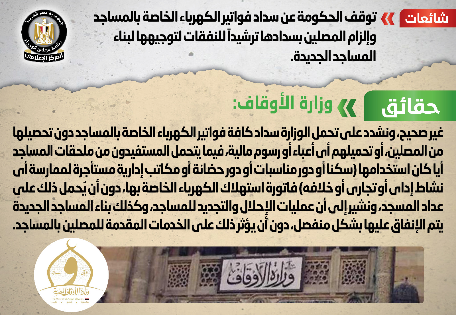 قام المركز الإعلامي لمجلس الوزراء بالتواصل مع وزارة الأوقاف، والتي نفت تلك الأنباء، مُؤكدةً أنه لا صحة لتوقف الحكومة عن سداد فواتير الكهرباء الخاصة بالمساجد وإلزام المصلين بسدادها ترشيداً للنفقات لتوجيهها لبناء المساجد الجديدة، مُشددةً على تحمل الوزارة سداد كافة فواتير الكهرباء الخاصة بالمساجد دون تحصيلها من المصلين، أو تحميلهم أي أعباء أو رسوم مالية، فيما يتحمل المستفيدون من ملحقات المساجد أيًِِِّا كان استخدامها (سكناً أو دور مناسبات أو دور حضانة أو مكاتب إدارية مستأجرة لممارسة أي نشاط إداري أو تجاري أو خلافه) فاتورة استهلاك الكهرباء الخاصة بها، دون أن يُحمل ذلك على عداد المسجد، مُشيرةً إلى أن عمليات الإحلال والتجديد للمساجد، وكذلك بناء المساجد الجديدة يتم الإنفاق عليها بشكل منفصل، دون أن يؤثر ذلك على الخدمات المقدمة للمصلين بالمساجد.