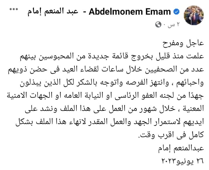 وقال النائب عبدالمنعم إمام عبر حسابه على موقع التواصل الاجتماعي "فيس بوك": علمت منذ قليل بخروج قائمة جديدة من المحبوسين بينهم عدد من الصحفيين خلال ساعات لقضاء العيد في حضن ذويهم واحبائهم.