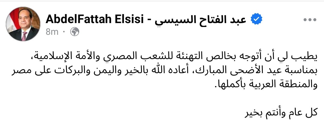 وقال الرئيس السيسي، عبر صفحته الرسمية على موقع التواصل الاجتماعي فيس بوك: يطيب لي أن أتوجه بخالص التهنئة للشعب المصري والأمة الإسلامية، بمناسبة عيد الأضحى المبارك، أعاده الله بالخير واليمن والبركات على مصر والمنطقة العربية بأكملها، كل عام وأنتم بخير.