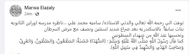 توفيت، منذ قليل، والدة الفنانة مروة الأزلى بعد صراع مع مرض السرطان، حيث أعلنت مروة الأزلى عبر حسابها الشخصى بموقع "فيس بوك" قائلة: "توفت إلى رحمة الله تعالى والدتى سامية محمد على.. ناظرة مدرسة لوران الثانوية بنات سابقاً بالإسكندرية بعد صراع شديد لسنتين ونصف مع مرض السرطان، ونحسبها عند الله من شهداء المبطونين".