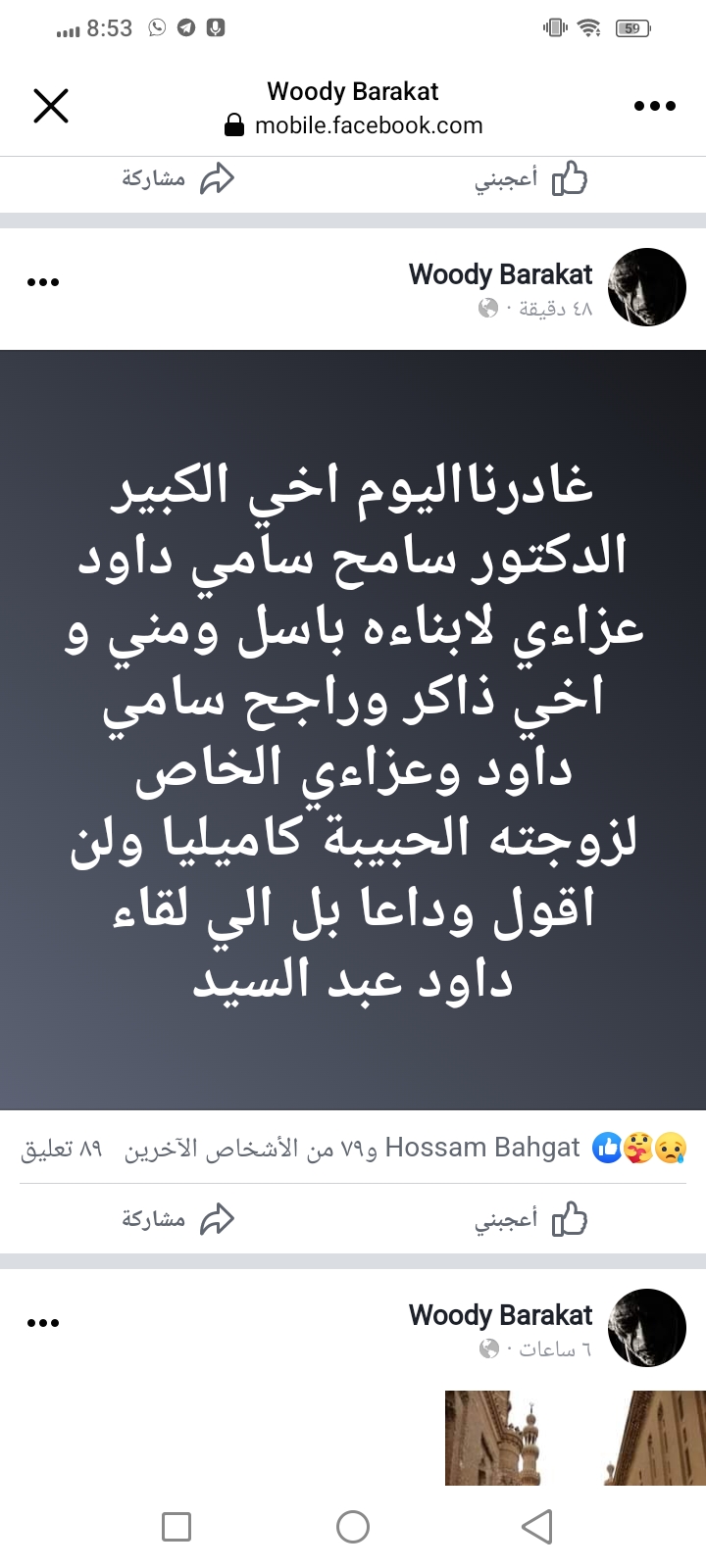 وكتب المخرج داوود عبدالسيد عبر حسابه الرسمي فيسبوك: "غادرنا اليوم أخي الكبير الدكتور سامح سامي داود، عزائي لأبنائه باسل ومنى وأخي ذاكر وراجح سامي داود، وعزائي الخاص لزوجته الحبيبة كاميليا ولن أقول وداعا بل إلى لقاء"