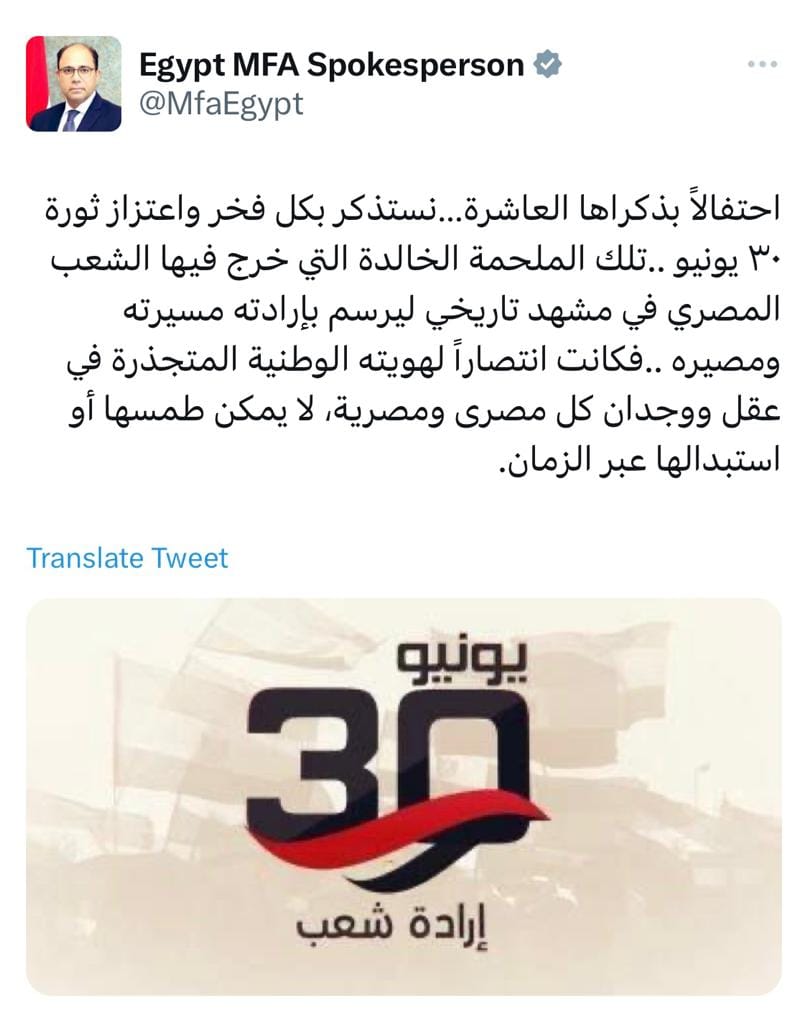 وكتب المتحدث الرسمي - في تدوينة عبر حسابه على موقع التواصل الاجتماعي تويتر اليوم الجمعة- "احتفالاً بذكراها العاشرة نستذكر بكل فخر واعتزاز ثورة 30 يونيو، تلك الملحمة الخالدة التي خرج فيها الشعب المصري في مشهد تاريخي ليرسم بإرادته مسيرته ومصيره، فكانت انتصاراً لهويته الوطنية المتجذرة في عقل ووجدان كل مصرى ومصرية، لا يمكن طمسها أو استبدالها عبر الزمان.