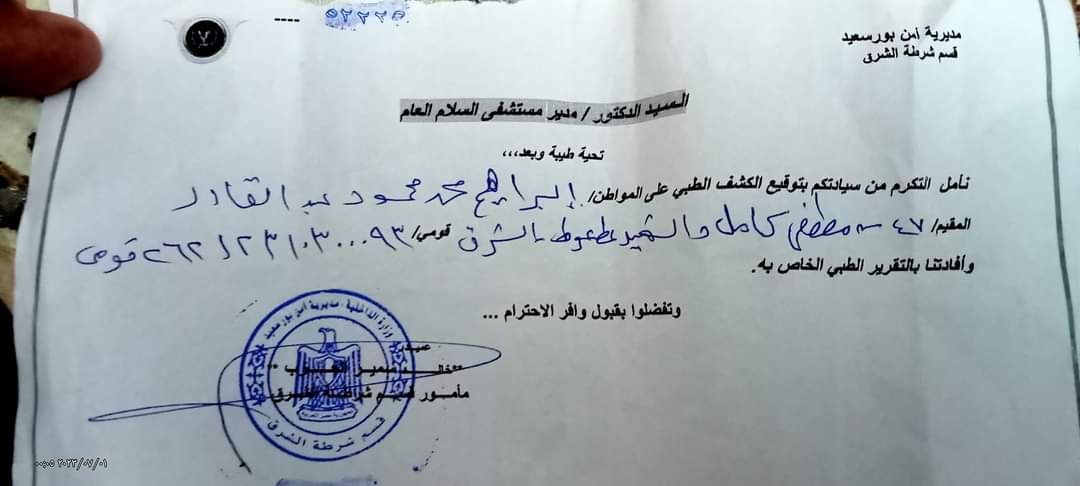 وأضاف عبد القادر أنه توجه إلى القسم بعد هروب الشاب والفتاة التي كانت معه، وقام بالإتصال بقيادات الشرطه بمديرية أمن بورسعيد وبالنجده وعمل محضر بقسم الشرق رقم (19) بتاريخ 30 يونيو أحوال الشرق، متضمنا بتقرير طبي بـ 5 غرز في اليد اليسرى والزراع الأيمن .