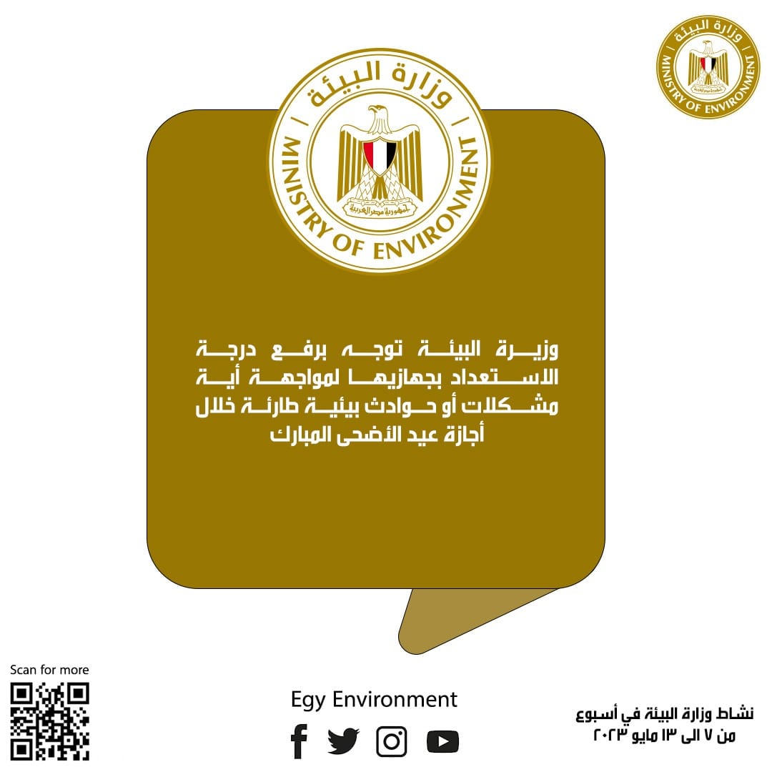 الدكتورة ياسمين فؤاد وزيرة البيئة، تصدر توجيهاتها برفع درجة الاستعداد بوزارة البيئة بجهازيها ( شئون البيئة و تنظيم إدارة المخلفات)، من خلال رفع درجة التأهب بغرفة العمليات المركزية بالوزارة على مدار أيام العيد خلال اجازة عيد الأضحى المبارك، للتدخل السريع لمواجهة المشكلات أوالحوادث البيئية الطارئة.