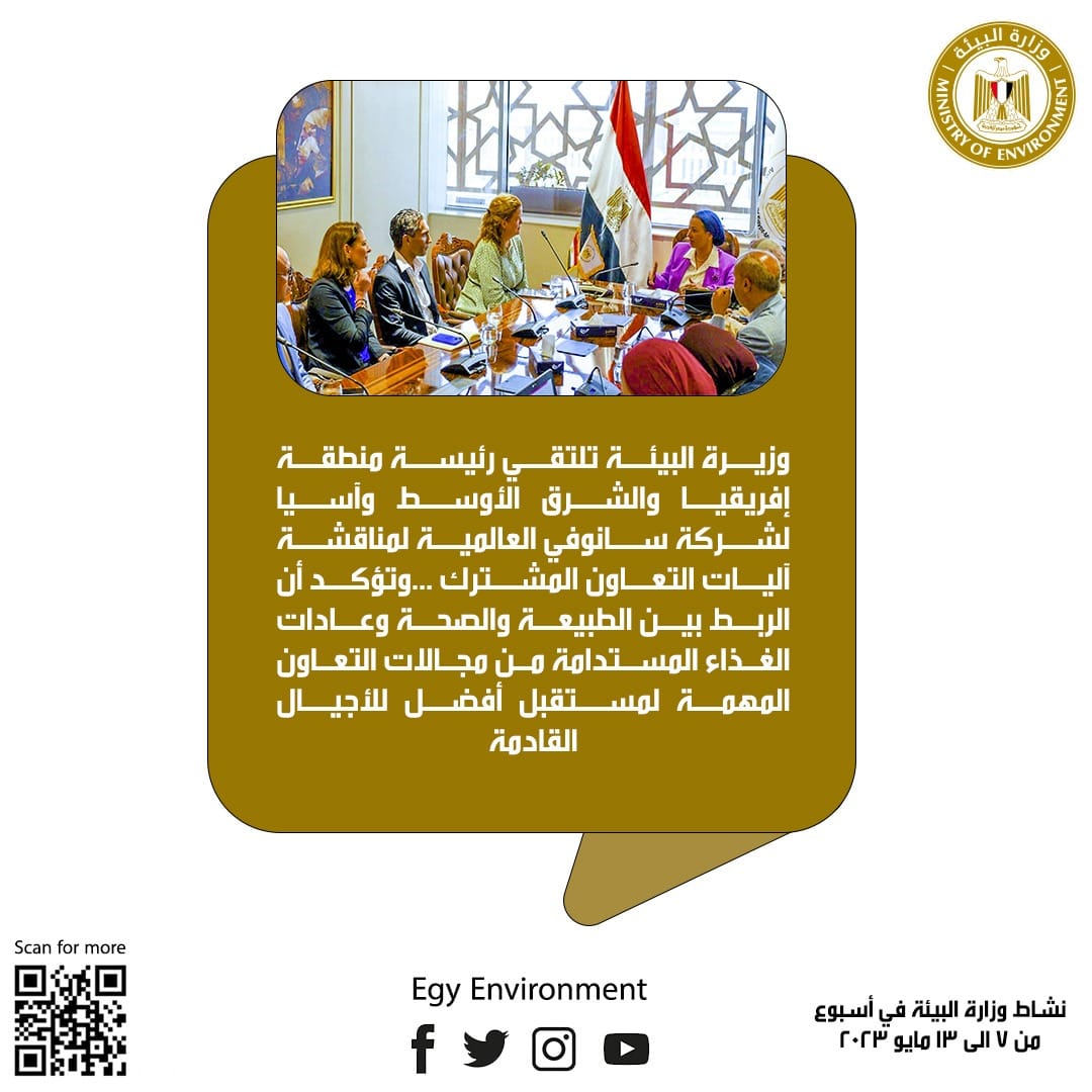الدكتورة ياسمين فؤاد وزيرة البيئة، تعقد اجتماعا مع السيدة كارول آن ستيوارت (رئيسة منطقة إفريقيا والشرق الأوسط وآسيا) لشركة سانوفي، والسيد ميكا نايدو (رئيس منطقة أفريقيا)، والوفد المرافق لهما، لمناقشة آليات البناء على التعاون المثمر خلال الفترة الماضية ومجالات جديدة للتعاون الثنائي المستقبلي.