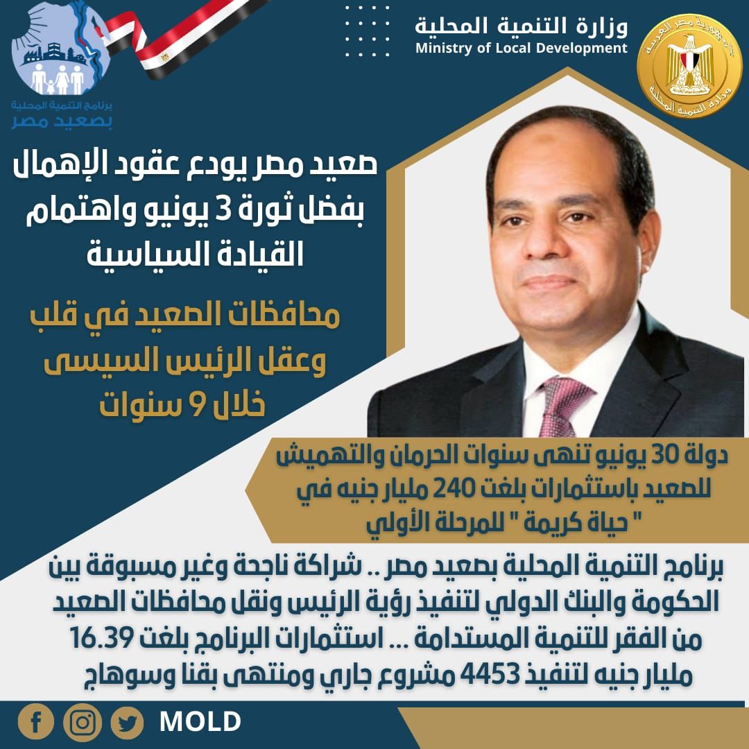 التنمية المحلية: صعيد مصر يودع عقود الإهمال بفضل ثورة 30 يونيو واهتمام القيادة السياسية