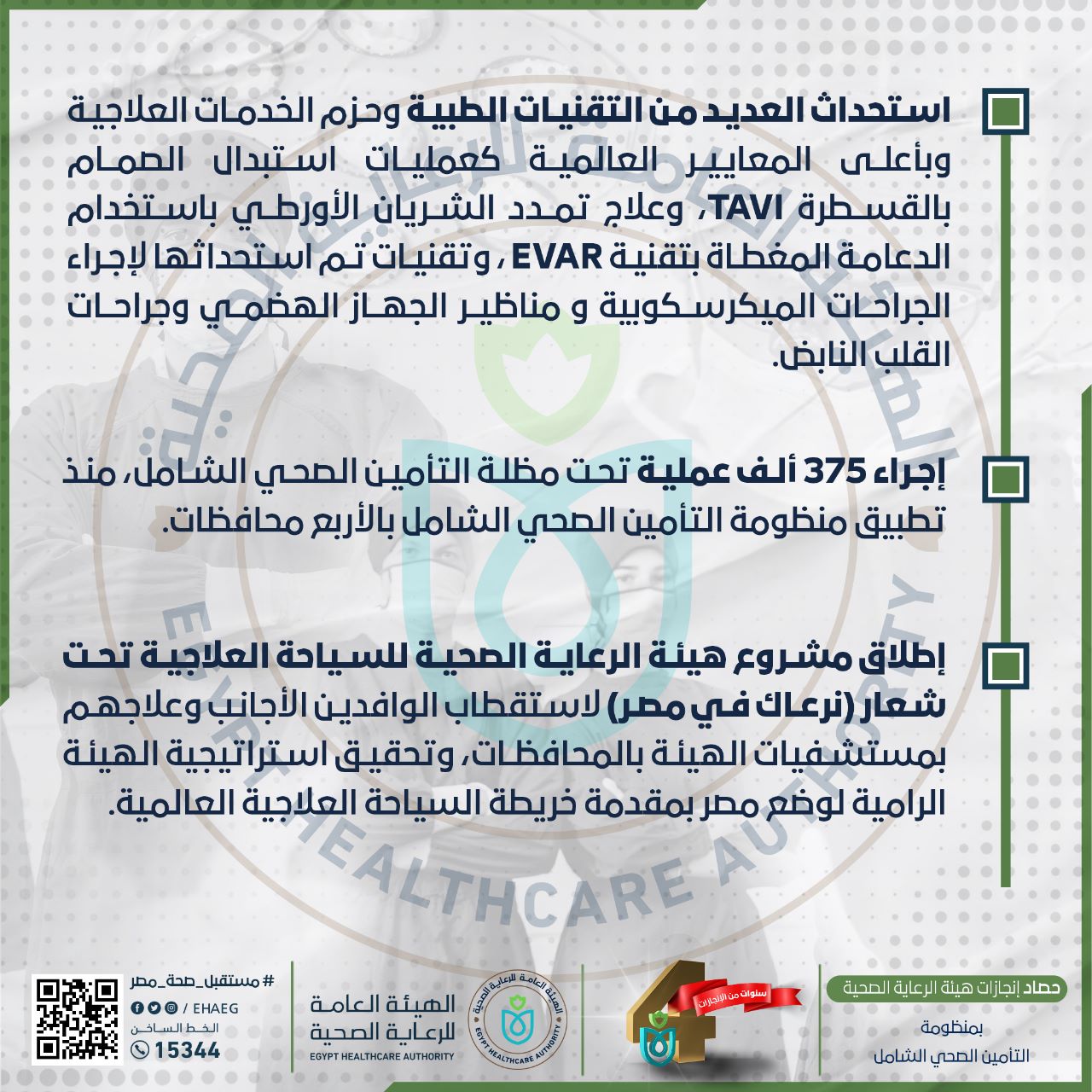 ووفقًا للانفوجراف، تم إجراء 375 ألف عملية بمستشفيات هيئة الرعاية الصحية بالأربع المحافظات، وذلك تحت مظلة التأمين الصحي الشامل، مشيرًا إلى استحداث العديد من التقنيات الطبية وحزم الخدمات العلاجية وبأعلى المعايير العالمية كعمليات استبدال الصمام بالقسطرة TAVI، وعلاج تمدد الشريان الأورطي باستخدام الدعامة المغطاة بتقنية EVAR ، وتقنيات تم استحداثها لإجراء الجراحات الميكرسكوبية و مناظير الجهاز الهضمي وجراحات القلب النابض.. إلخ