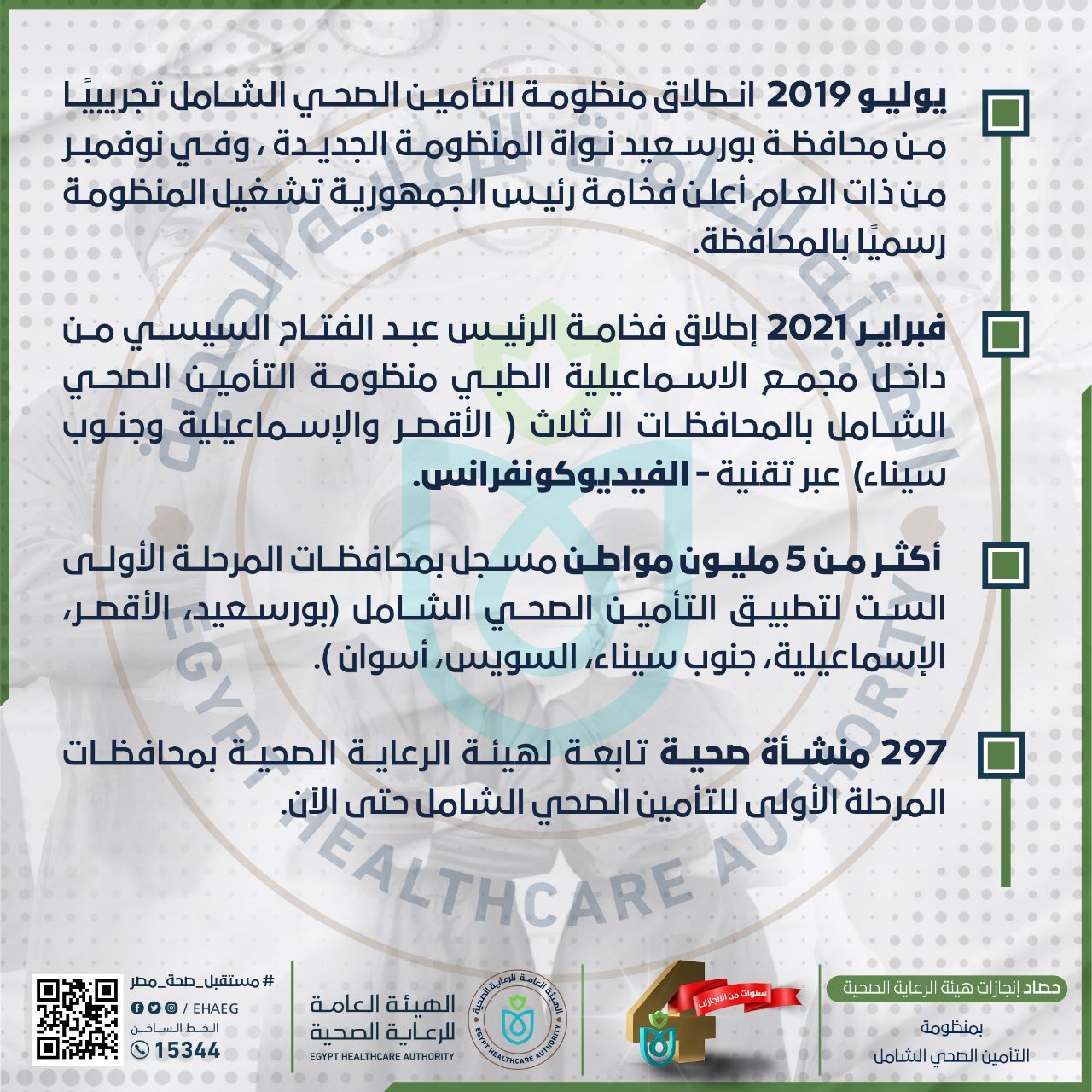 بعد مرور 4 سنوات من إطلاق رئيس جمهورية مصر العربية، الرئيس عبد الفتاح السيسي القائد التاريخي للإصلاح الصحي الشامل في مصر، لمنظومة التأمين الصحي الشامل الجديدة، وذلك من محافظة بورسعيد في يوليو 2019 ، معلنًا تشغيل المنظومة رسميًا في نوفمبر من ذات العام.