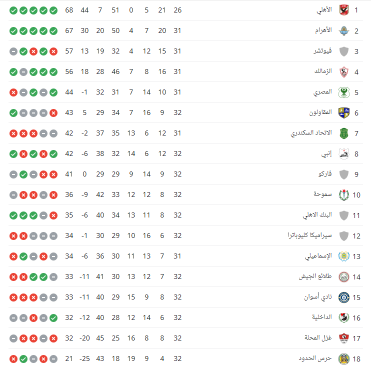 وجاء جدول ترتيب الدوري المصري كالاتي: