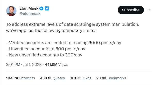 وأردف ايلون ماسك قائلا: "لمعالجة المستويات القصوى من استخراج البيانات والتلاعب بالنظام، طبقنا الحدود المؤقتة التالية"، موضحًا أن الحسابات التي تم التحقق منها تقتصر على قراءة 6000 تدوينة فقط في اليوم، والحسابات التي لم يتم التحقق منها إلى 600 تدوينة في اليوم، والحسابات الجديدة التي لم يتم التحقق منها 300 تدوينة في يوم”.