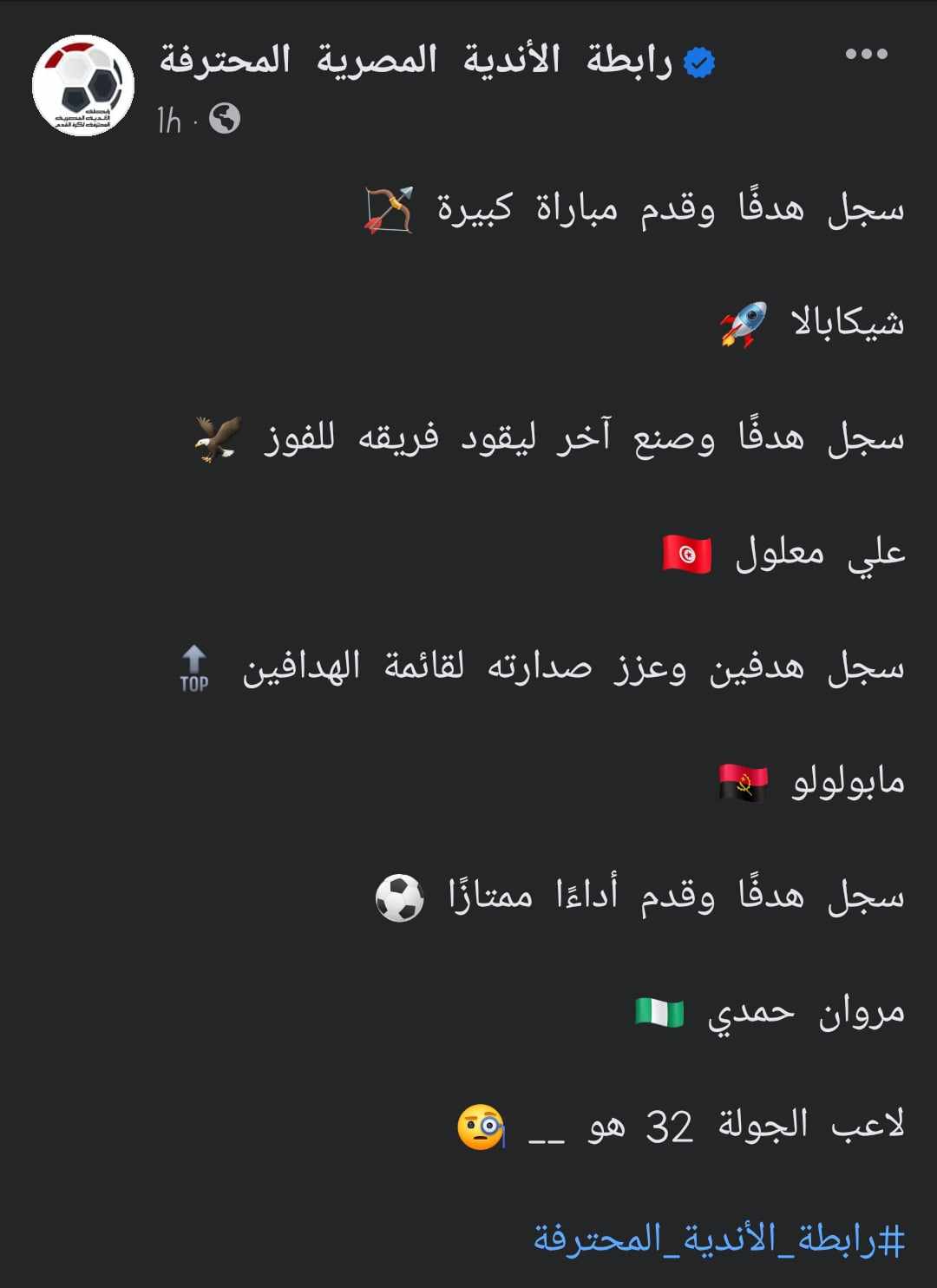 كشفت رابطة الأندية المصرية المحترفة عن أسماء المرشحين لجائزة الأفضل في الجولة الـ 32 من الدوري المصري الممتاز موسم 2022-2023 بتصويت الجماهير.