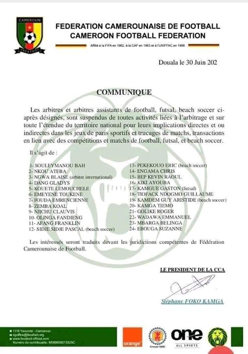 أعلن الاتحاد الكاميروني، اليوم الأحد، بياناً رسمياً عبر حسابه على موقع التواصل الاجتماعي تويتر، إيقاف 24 حكما لكرة القدم وكرة الصالات، بسبب تلاعبهم في النتائج ومشاركتهم في المراهنات خلال الفترة الماضية.