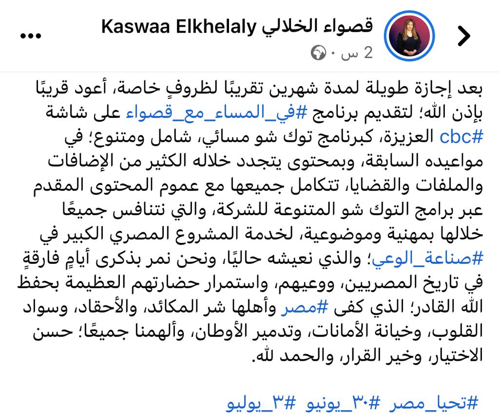 وكتبت قصواء عبر حسابها الشخصي على موقع "فيسبوك": "أعود قريبًا بإذن الله؛ لتقديم برنامج في المساء مع قصواء على شاشة cbc العزيزة، كبرنامج توك شو مسائي، شامل ومتنوع؛ في مواعيده السابقة، وبمحتوى يتجدد خلاله الكثير من الإضافات والملفات والقضايا، تتكامل جميعها مع عموم المحتوى المقدم عبر برامج التوك شو المتنوعة للشركة، والتي نتنافس جميعًا خلالها بمهنية وموضوعية، لخدمة المشروع المصري الكبير في صناعة الوعي؛ والذي نعيشه حاليًا، ونحن نمر بذكرى أيامٍ فارقةٍ في تاريخ المصريين، ووعيهم، واستمرار حضارتهم العظيمة بحفظ الله القادر؛ الذي كفى مصر وأهلها شر المكائد، والأحقاد، وسواد القلوب، وخيانة الأمانات، وتدمير الأوطان، وألهمنا جميعًا؛ حسن الاختيار، وخير القرار، والحمد لله".