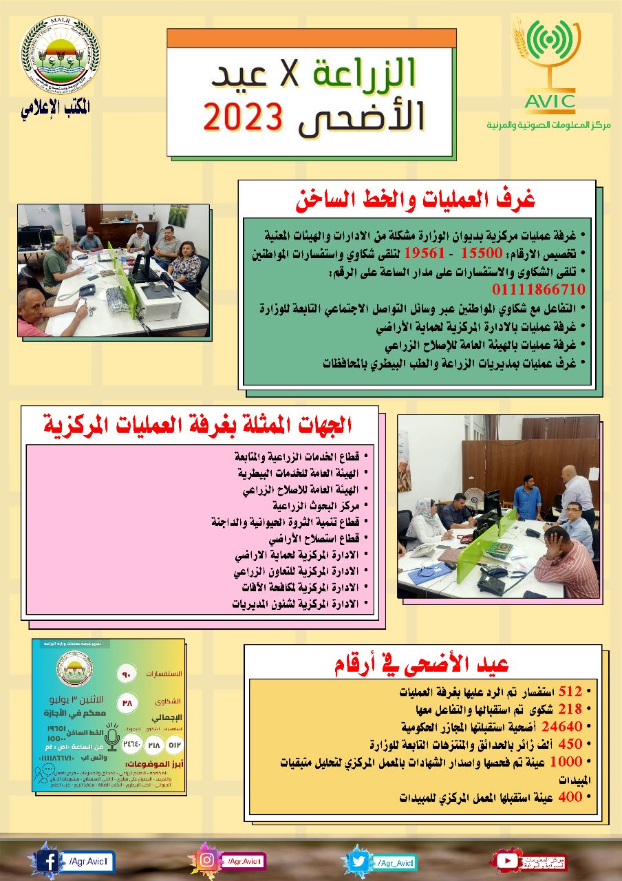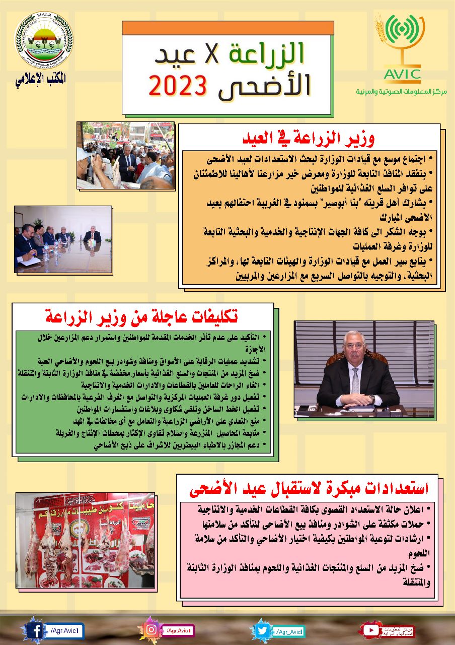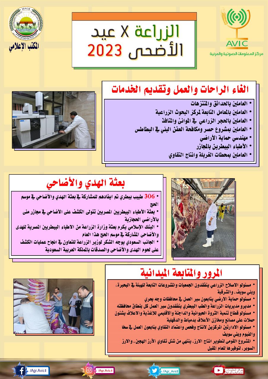 نشر مركز المعلومات الصوتية والمرئية بوزارة الزراعة واستصلاح الأراضي، والمكتب الإعلامي للوزارة، إنفوجراف بعنوان: "الزراعة في عيد الأضحى"، يشمل على أبرز انشطة الوزارة وقطاعاتها وهيئاتها المختلفة خلال فترة اجازة عيد الأضحى، وثورة 30 يونيو.