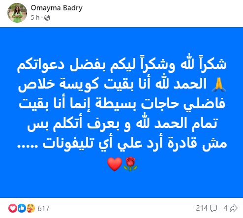 وقالت أميمة بدري ،" شكرًا لكل حد بيسأل وبيطمن عليا بس ده حالي وصوتي طلع حبه الصبح مكنش في اي صوت ولا حركة شفايفي ولسه تعبانه فمش عارفه ولا قادرة اتواصل قولت اطمنكم بحالي هنا أسهل .. دعواتكم والحمد لله علي كل شئ.. بقولكم آسفه لكل حد بيسأل وبيطمن عليا بس مش عارفه أرد ادعولي أكون كويسه".