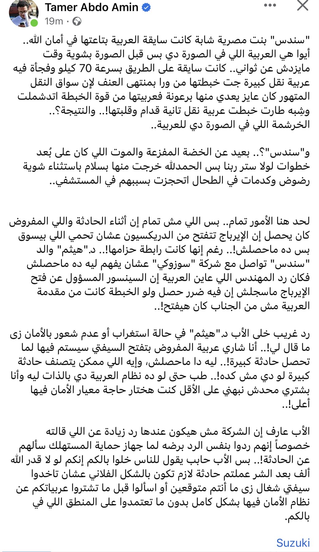 وقال ،" الأب عارف إن الشركة مش هيكون عندها رد زيادة عن اللي قالته خصوصاً إنهم ردوا بنفس الرد برضه لما جهاز حماية المستهلك سألهم عن الحادثة!.. بس الأب حابب يقول للناس خلوا بالكم إنكم لو لا قدر الله ألف بعد الشر عملتم حادثة لازم تكون بالشكل الفلانيعشان تاخدوا سيفتي شغال زى ما أنتم متوقعين أو اسألوا قبل ما تشتروا عربياتكم عن نظام الأمان فيها بشكل كامل بدون ما تعتمدوا علىالمنطق اللي في بالكم.