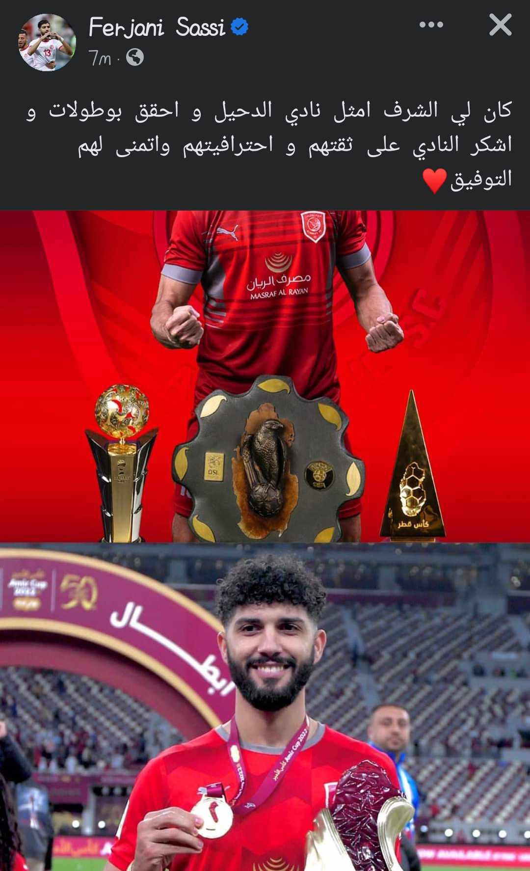 حرص اللاعب التونسى فرجانى ساسي، على توجيه رسالة شكر إلى نادي الدحيل القطري بعد رحيله، والانضمام إلى الغرافة القطري بشكل رسمي.