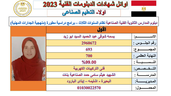 ينشر "مصر تايمز" أسماء وصور الأوائل بنتيجة امتحانات الدبلومات الفنية 2023، واعتمد الدكتور رضا حجازى وزير التربية والتعليم والتعليم الفنى نتيجة الدبلومات الفنية 2023، بنسبة نجاح 64,47%.