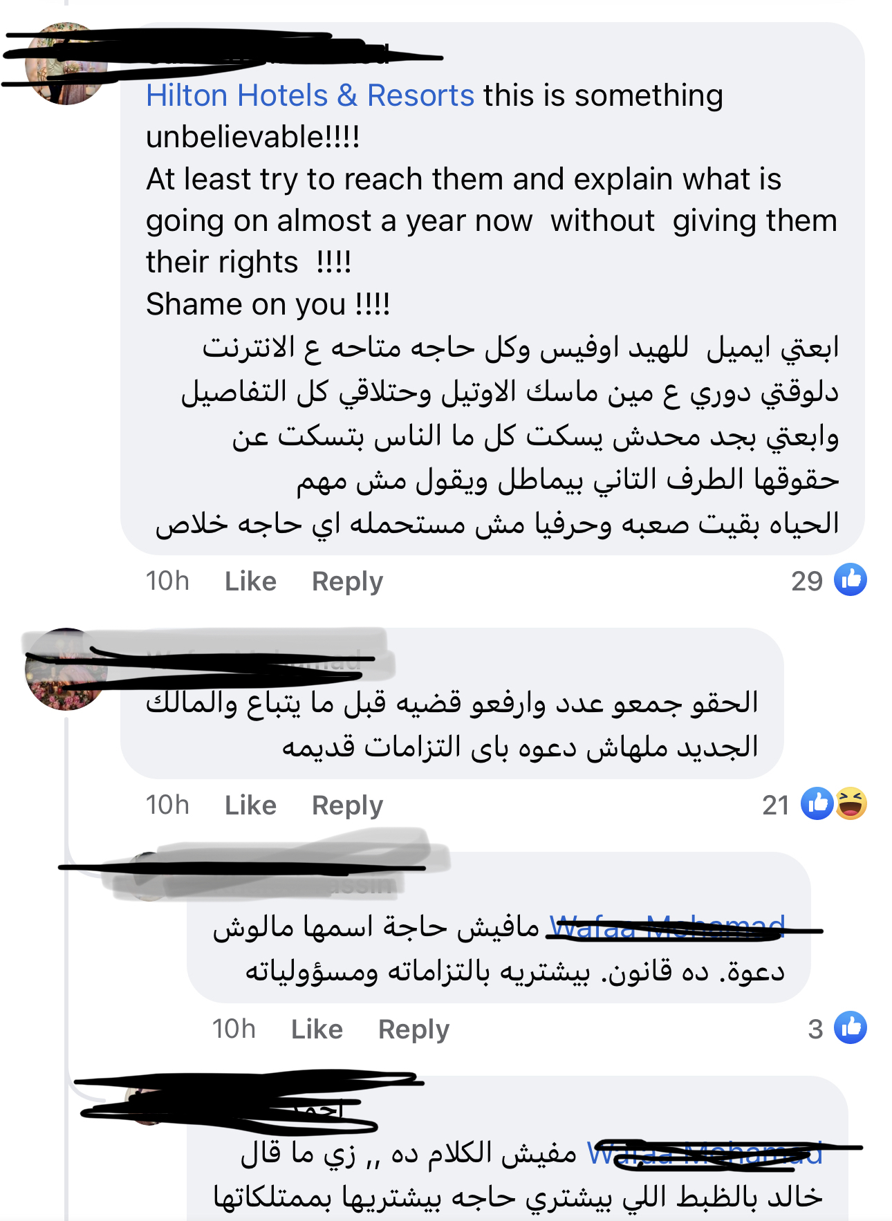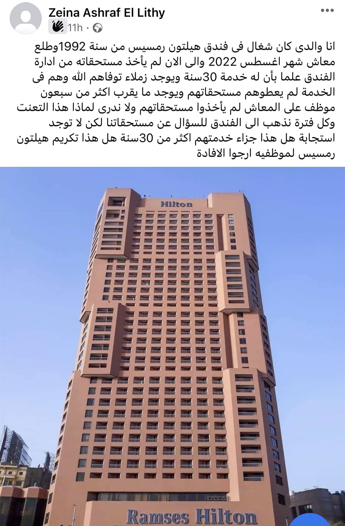 وقالت صاحبة المشكلة،"انا والدى كان شغال فى فندق هيلتون رمسيس من سنة 1992وطلع معاش شهر اغسطس 2022 والى الان لميأخذ مستحقاته من ادارة الفندق علما بأن له خدمة 30سنة ويوجد زملاء توفاهم الله وهم فى الخدمة لم يعطوهم مستحقاتهم ويوجد ما يقرباكثر من سبعون موظف على المعاش لم يأخذوا مستحقاتهم ولا ندرى لماذا هذا التعنت وكل فترة نذهب الى الفندق للسؤال عن مستحقاتنالكن لا توجد استجابة هل هذا جزاء خدمتهم اكثر من 30سنة هل هذا تكريم هيلتون رمسيس لموظفيه".