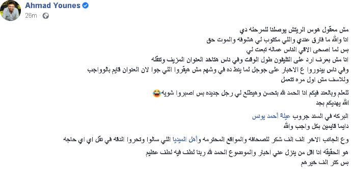 كتب أحمد يونس عبر صفحته على موقع التواصل الإجتماعي "الفيسبوك" قائلا:" مش معقول هوس الريتش يوصلنا للمرحلة دي؟ أنا والله ما فارق عندي واللي مكتوب لي هشوفه والموت حق، بس لما أصحى ألاقي الناس عمالة تبعت لي، أنا مش بعرف أرد على التليفون طول الوقت وفي ناس هتاخد العنوان المزيف وتنقله".