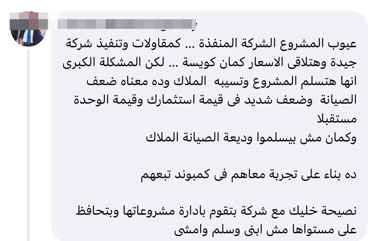 وقال مواطن ، عيوب المشروع الشركة المنفذة … كمقاولات وتنفيذ شركة جيدة وهتلاقى الاسعار كمان كويسة … لكن المشكلة الكبرى انها هتسلم المشروع وتسيبه الملاك وده معناه ضعف الصيانة وضعف شديد فى قيمة..استثمارك وقيمة الوحدة مستقبلا.. وكمان مش بيسلموا وديعة الصيانة الملاك..ده بناء على تجربة معاهم فى كمبوند تبعهم..نصيحة خليك مع شركة بتقوم بادارة مشروعاتها وبتحافظ على مستواها مش ابنى وسلم وامشى".