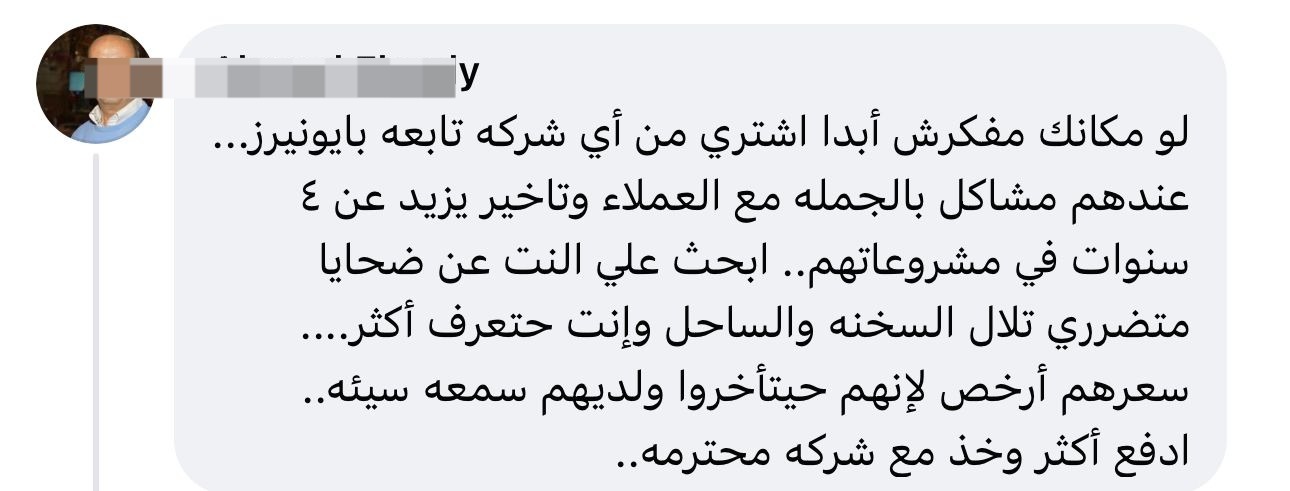 وتابع آخر فى نصيحته،" شركه تعبانه و متعثره ة مكان الكمبوند كان مقلب زباله زمان"، وقال أخر" لو مكانك مفكرش أبدا اشتري من أي شركه تابعه بايونيرز... عندهم مشاكل بالجمله مع العملاء وتاخير يزيد عن ٤ سنوات في مشروعاتهم.. ابحث علي النت عن ضحايا متضرري تلال السخنه والساحل وإنت حتعرف أكثر.... سعرهم أرخص لإنهم حيتأخروا ولديهم سمعه سيئة".
