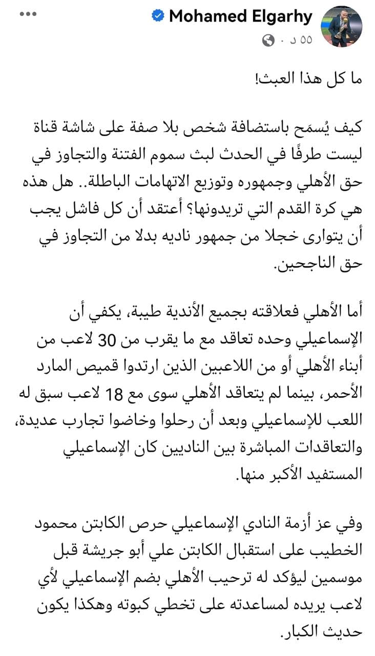 وأضاف: "أما الأهلي فعلاقته بجميع الأندية طيبة، يكفي أن الإسماعيلي وحده تعاقد مع ما يقرب من 30 لاعبا من أبناء الأهلي أو من اللاعبين الذين ارتدوا قميص المارد الأحمر، بينما لم يتعاقد الأهلي سوى مع 18 لاعبا سبق له اللعب للإسماعيلي، وبعد أن رحلوا وخاضوا تجارب عديدة، والتعاقدات المباشرة بين الناديين كان الإسماعيلي المستفيد الأكبر منها".