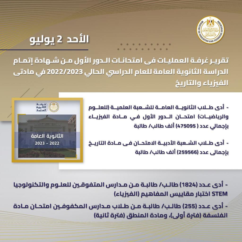 أعلنت وزارة التربية والتعليم والتعليم الفني عن استئناف امتحانات الدور الاول للثانوية العامة الأحد الموافق 2 يوليو 2023، حيث من المقرر أن يؤدى طلاب الشعبة العلمية امتحان مادة الفيزياء ويؤدى طلاب الشعبة الأدبية امتحان مادة التاريخ، وذلك حسب الجدول المعتمد لامتحانات الثانوية العامة.