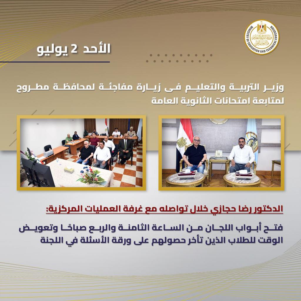 قام الدكتور رضا حجازي وزير التربية والتعليم، بزيارة مفاجئة لمحافظة مطروح لمتابعة انتظام سير امتحانات الثانوية العامة الدور الاول بمختلف لجان المحافظة.