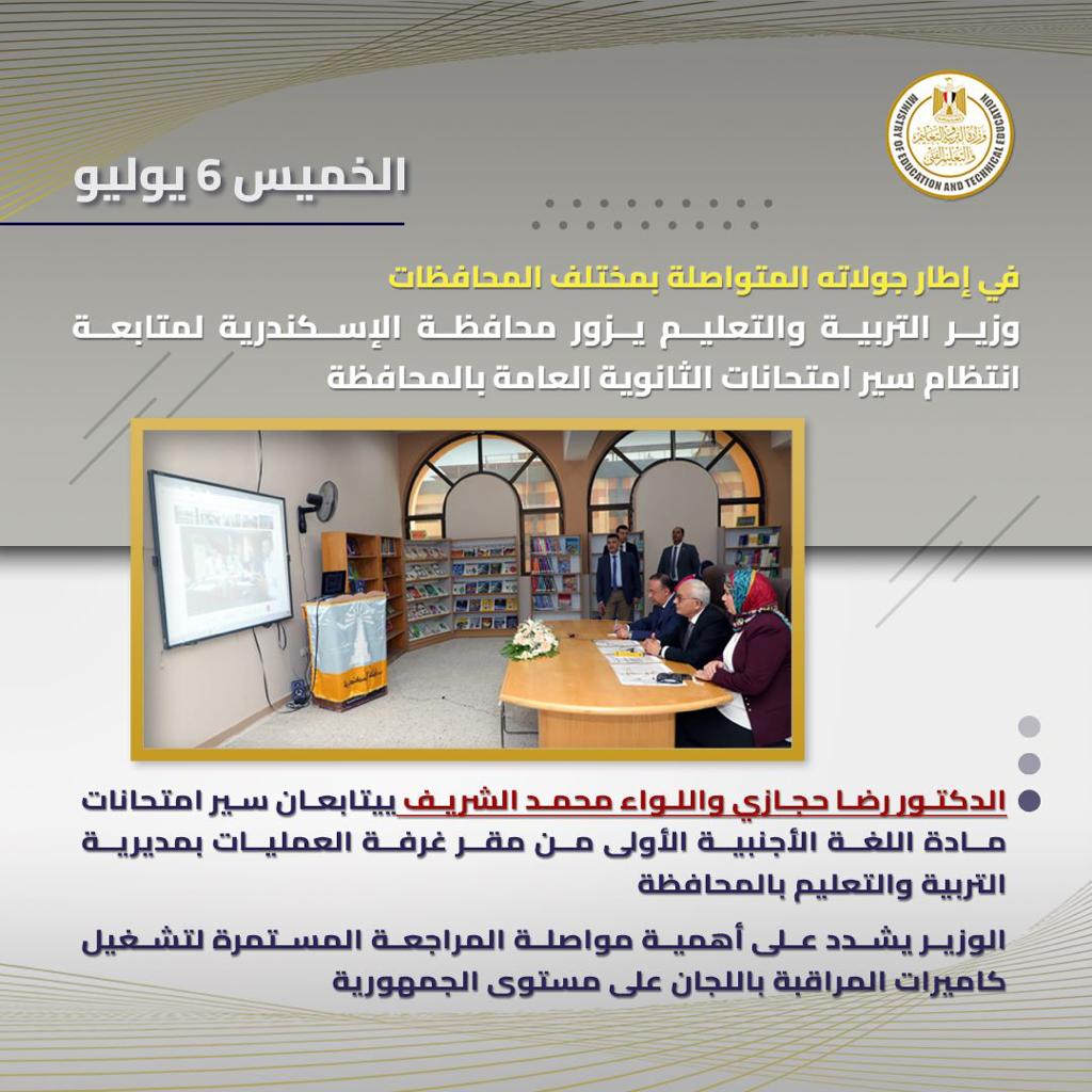 وقد حرص الدكتور رضا حجازى وزير التربية والتعليم والتعليم الفنى ورئيس عام امتحانات الثانوية العامة، على متابعة امتحانات الثانوية العامة (الدور الأول) من خلال تقنية الفيديو كونفرانس بمقر غرفة العمليات بمديرية التربية والتعليم بمحافظة الإسكندرية، حيث اطمأن على سير العملية الامتحانية بجميع المحافظات.